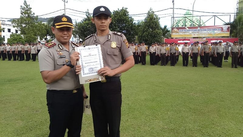 LUBUKLINGGAU, Sumatera Headline – Kapolres lubuklinggau, AKBP Dwi Hartono memberikan penghargaan kepada Brigadir Dendi Irawan anggota SPKT Polres Lubuklinggau atas keberaniannya bersama masyarakat mengagalkan aksi pencurian dengan kekerasan (pecah kaca mobil) pada hari jumat (30/10/2018) lalu.