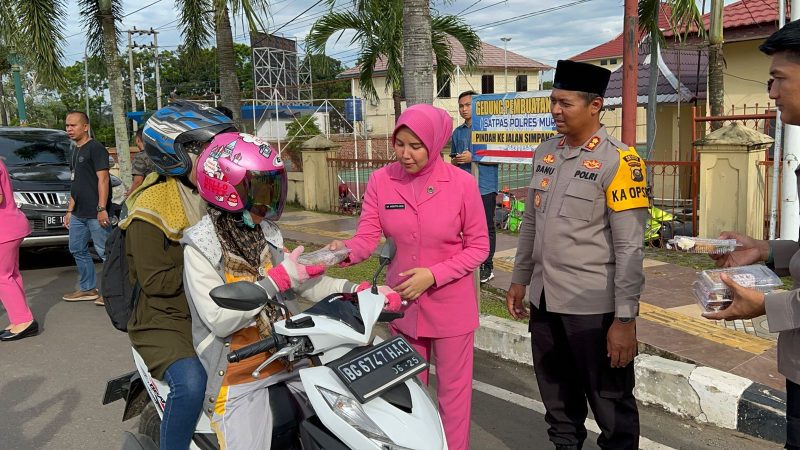 MUSI RAWAS, SumateraHeadline– Di bulan yang penuh barokah ini, Kapolres Mura, AKBP Danu Agus Purnomo didampingi Ketua Bhayangkari Cabang Mura, Ny Anggitta Danu, membagikan takjil kepada para pengendara yang melintas, Jumat (3/3/2023) sore sekitar pukul 16.00 Wib.