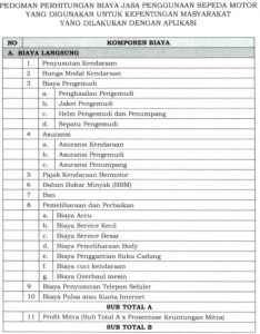 Disebutkan dalam Kepmenhub ini, biaya jasa sepeda motor yang digunakan untuk kepentingan masyarakat yang dilakukan dengan aplikasi terdiri dari: a. biaya jasa batas atas; b. biaya jasa batas bawah; dan c. biaya jasa minimal.
