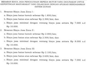Selanjutnya menurut Kepmenhub ini, perusahaan aplikasi menerapkan besaran biaya jasa batas bawah, biaya jasa batas atas, dan biaya jasa minimal berdasarkan sistem zonasi sebagaimana ditentukan di atas.