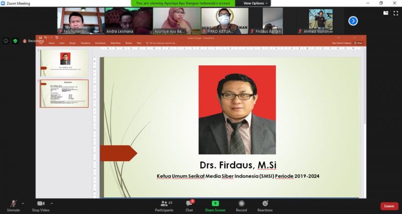PALEMBANG, SH – Ketua Umum Serikat Media Siber Indonesia (SMSI) Firdaus hadir di tengah mahasiswa. Pada momen itu, Firdaus dinobatkan sebagai pembicara utama (keynote speaker) pada webinar nasional. Seminar virtual itu digelar Lembaga Pers Mahasiswa Gelora Sriwijaya Universitas Sriwijaya (LPM GS Unsri) pada Sabtu (18/7).