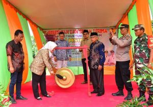 Bupati Mura, Hj Ratna Machmud ketika memukul gong sebagai simbolis diresmikannya Pamsimas.