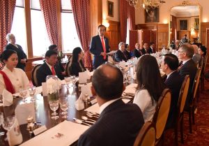 Dalam jamuan santap siang kenegaraan ini Presiden dan Ibu Iriana Joko Widodo didampingi juga antara lain oleh Menteri Koordinator Politik, Hukum, dan Keamanan Wiranto, Menteri Sekretaris Negara Pratikno, Menteri Luar Negeri Retno Marsudi, Kepala BKPM Thomas Lembong, Duta Besar RI untuk Selandia Baru Tantowi Yahya, dan Ketua Umum Kadin Rosan Perkasa Roeslani.