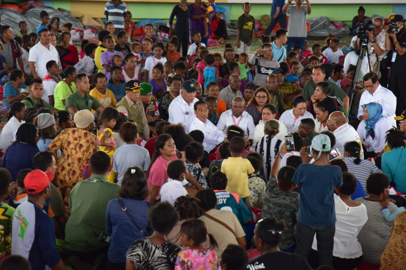 JAYAPURA, SH – Usai mendengarkan paparan dan menyaksikan penandatanganan MoU pemulihan pasca bencana, Presiden Joko Widodo (Jokowi) didampingi Ibu Negara Iriana melanjutkan kegiatan dengan mengunjungi warga korban banjir bandang Sentani yang terjadi beberapa waktu lalu, di Posko Pengungsian GOR (Gedung Olahraga) Toware, Sentani, Kabupaten Jayapura, Papua, Senin (1/4) siang.