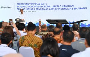 SEMARANG, Sumatera Headline – Presiden Joko Widodo meresmikan terminal baru Bandar Udara Internasional Ahmad Yani, Semarang, Provinsi Jawa Tengah, Kamis (7/6/2018). Peresmian ditandai dengan penekanan sirine secara simbolis oleh Presiden.