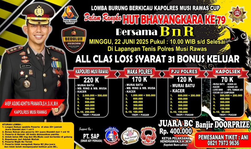 MUSI RAWAS – Dalam rangka menyambut Hari Bhayangkara ke-79, Polres Musi Rawas (Mura) akan menggelar Lomba Burung Berkicau “Kapolres Musi Rawas Cup”. Lomba tersebut akan dilaksanakan pada Minggu (22/6/2025) yang dipusatkan di Lapangan Tenis Mapolres Mura, kawasan Agropolitan Center, Kecamatan Muara Beliti.