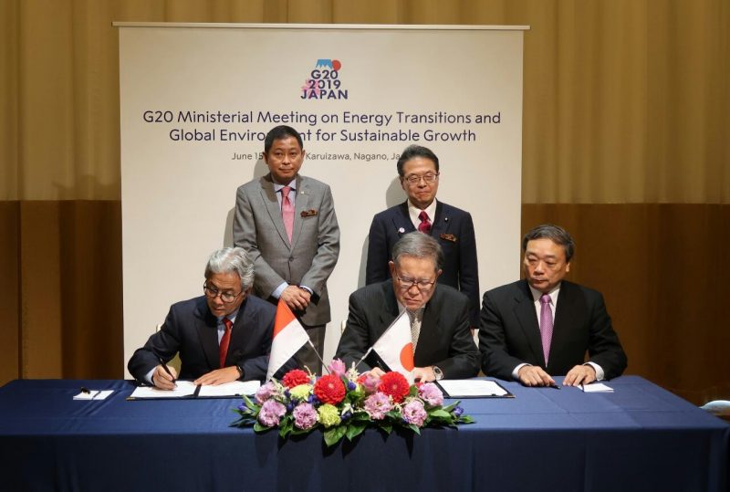 Menteri Energi dan Sumber Daya Mineral (ESDM) Ignasius Jonan dan Menteri Ekonomi, Perdagangan dan Industri (METI) Jepang, Hiroshige Seko, serta  Takayuki Ueda, CEO dan Presiden Direktur INPEX Corporation, menyaksikan langsung penandatanganan tersebut.