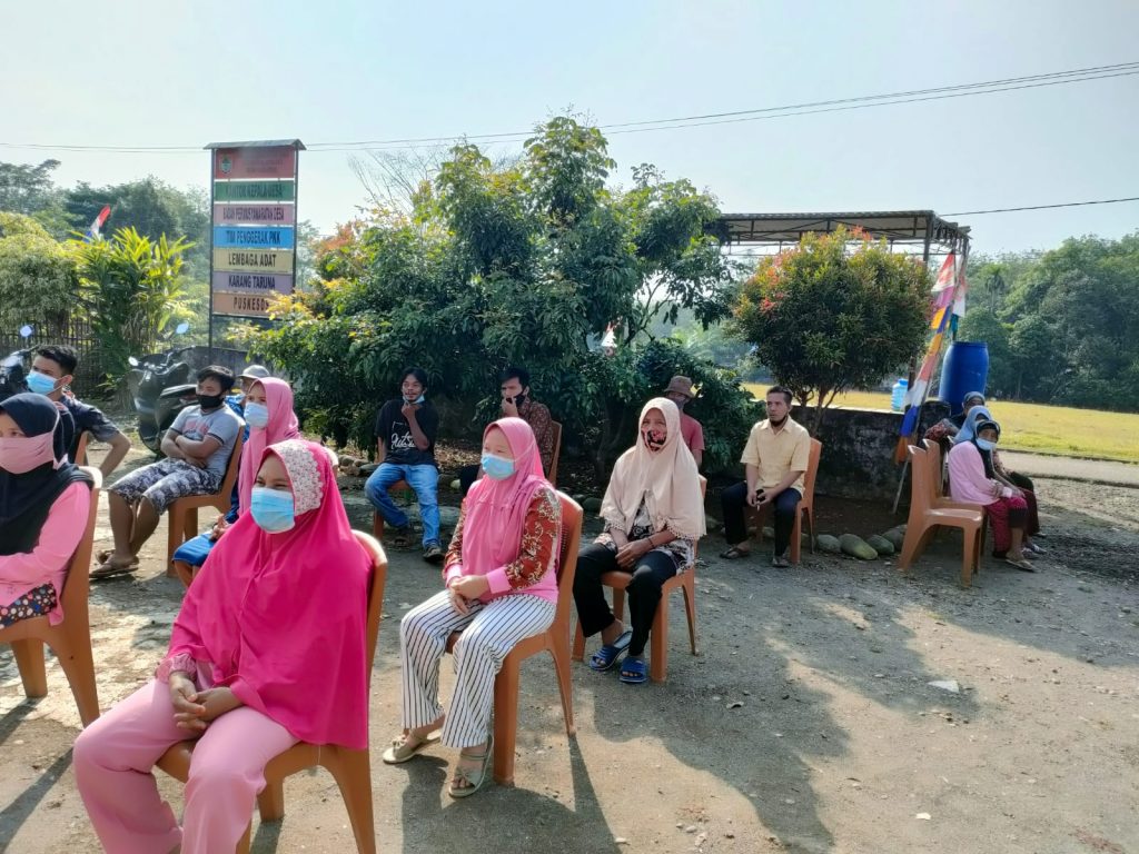 Terlihat antusias warga Desa Margatani Kecamatan Jayaloka saat mengikuti sosialisasi Protokol Kesehatan Covid-19 5 M di Halaman Balai Kantor Desa Margatani, (26/8)