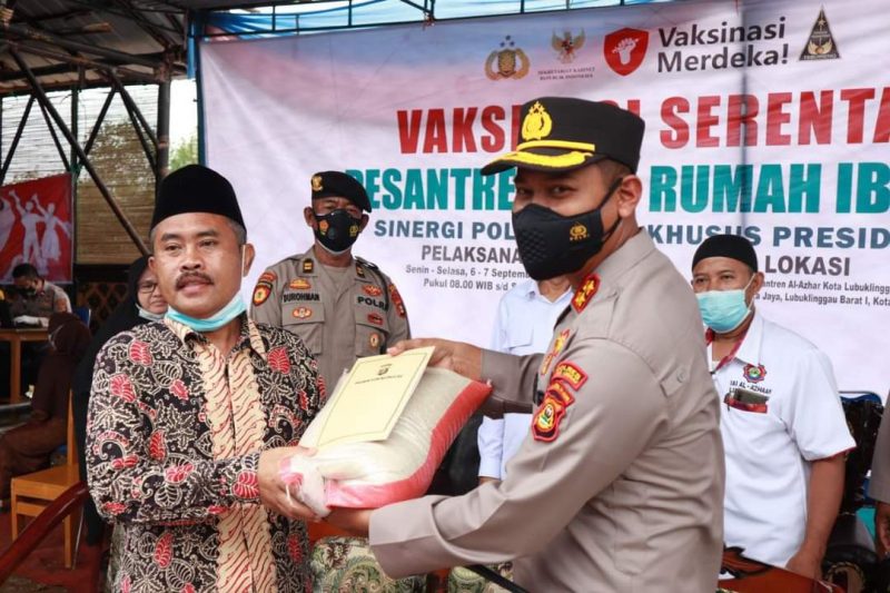 LUBUKLINGGAU, SH – Polres Lubuklinggau melaksanakan vaksinasi serentak se-Indonesia terhadap santri dan pengurus masjid yang dipusatkan di Pondok Pesantren Al Azhaar, Kota Lubuklinggau, Selasa (7/9/2021).