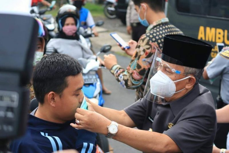 LUBUKLINGGAU, SH – Wakil Wali Kota Lubuklinggau, H Sulaiman Kohar bersama dinas instansi terkait membagikan masker secara gratis di wilayah Kota Lubuklinggau sekaligus menyampaikan himbauan protokol kesehatan guna mencegah penyebaran Covid-19 yang terus meningkat.